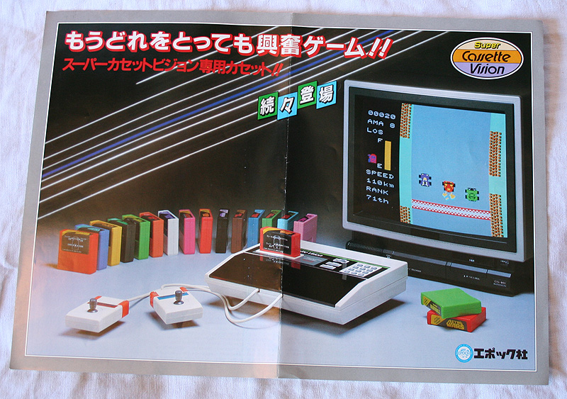 The Super Cassette Vision (Japanese: スーパーカセットビジョン, Hepburn: Suupaa Kasetto Bijon) is a home video game console made by Epoch Co. and released in Japan on July 17, 1984, and in Europe, specifically France, later in 1984. A successor to the Cassette Vision, it competed with Nintendo's Family Computer and Sega's SG-1000 line in Japan.